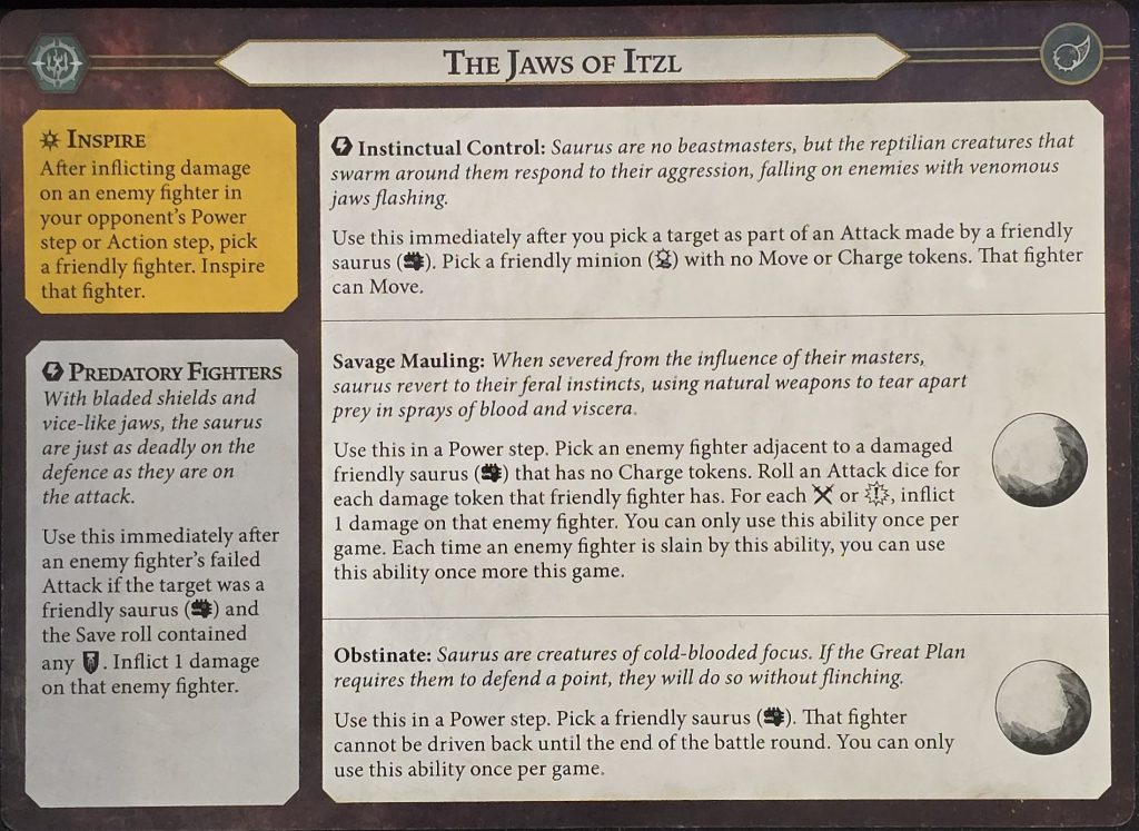 Instinctual Control, which helps this four fighter warband get some extra action economy by letting Sotek’s Venomites (the reptile pile) get a free move after you choose a target for a Saurus to attack. The timing here is after the target is picked, but before the roll is made so if the Venomites are close enough they can be scooched in to help flank, or just move off to do whatever work you need a 0 bounty snake pile to perform. You can technically use this repeatedly, but since the Venomites can’t have a move or charge token on them to make the extra move, it’s going to effectively be once per battle round barring shenanigans.