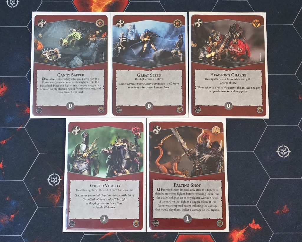 Ploys versus upgrades feels more straightforward to me, at least. I pretty much always want a nice chunk of ploys in my starting hand. If four to five of the starting five cards are upgrades, I'm inclined to throw them back. If I have three upgrades and two ploys, it comes down more to which specific ones I have in hand and how useful I expect them to be in the first round of the game. And, of course, there are some upgrades that feel more like ploys – the 0-cost Great Speed, Headlong Charge, and Canny Sapper are all able to be played before you earn any glory, so they function very similarly to a ploy. There are also a handful of upgrades that I would prioritize having access to early instead of late game. Parting Shot from Edge of the Knife is great if you can throw it out on the first fighter you shove up front into the enemy's range to discourage attacks. The new Gifted Vitality from Raging Slayers heals the equipped fighter at the end of each round, so it's going to have a larger overall impact if you can get it out in the first round.