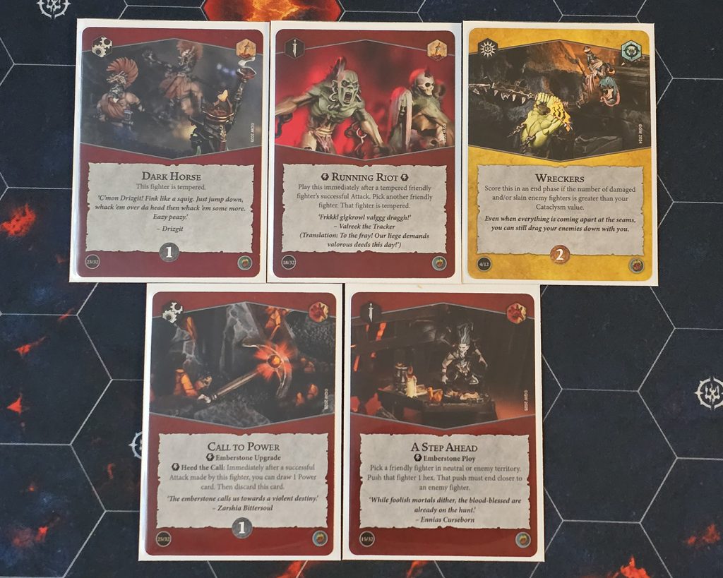 Stay on your toes, though, because these priorities could also change based on what your opponent is bringing on their side of the table. Cards granting cleave or ensnare are obviously dependent on your opponent's fighters' saves (although it can still be useful for cracking through fighters on guard) and some cards like Gloryseeker could wind up being completely dead cards if the opposing warband doesn't have any fighters with a health characteristic of four or greater. The infamous Wreckers from Countdown to Cataclysm is going to be easier to score against a weak horde than it will be against a lower model count elite warband.