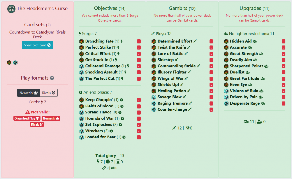 The left side lists all the current Rivals decks split up by their archetypes as given by GW. It also includes a little icon to denote if any of them have plot cards, which is helpful because you are only allowed a single deck with a plot card in Nemesis. If you don't know the deck icons by heart, you can mouse over them to get a tool tip including the deck name.