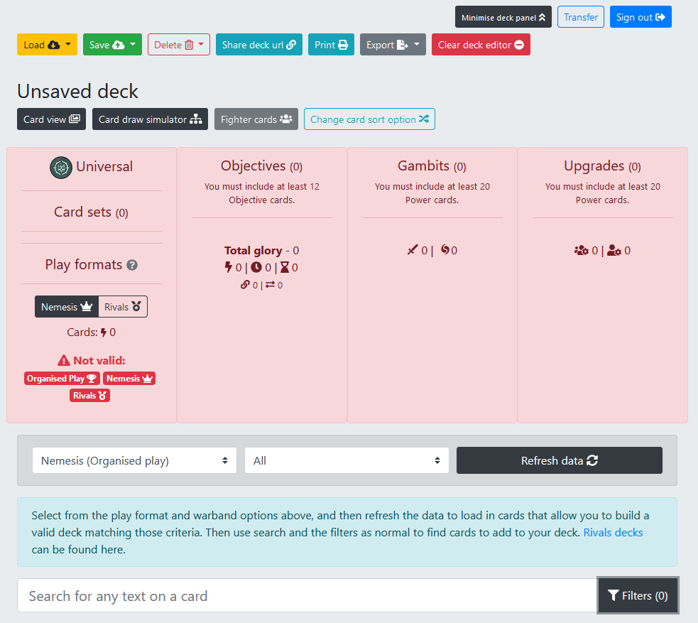 A clean slate for building your deck over at Underworlds DB. Yours will show "Sign in" in the top right until/unless you sign in with a Google account. Credit: underworldsdb.com