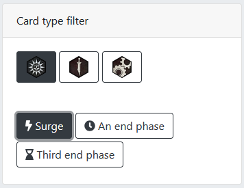 Card type filter on the right side of the filter panel. My deck building process tends to start with the surge objectives, then end phase objectives, then either the ploys or upgrades – I do it this way because games are won or lost based on who can score their objectives, so I want to make sure the rest of my deck is centered around supporting them.