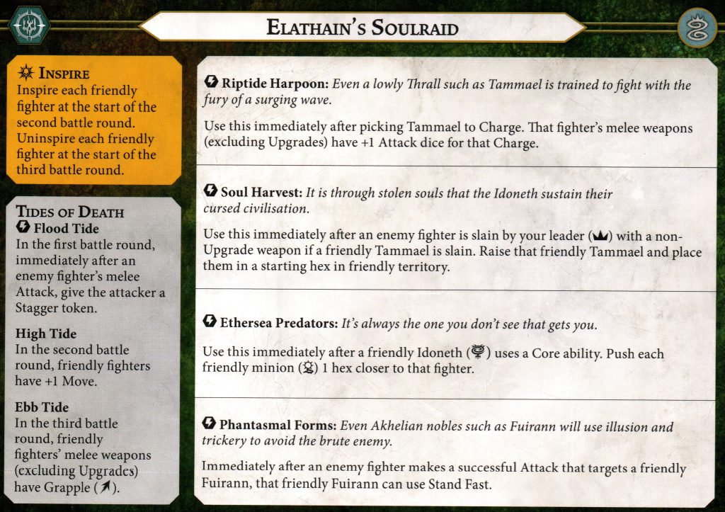 The tidal themed inspire is still present with the Soulraid. They all start uninspired, spend the second round inspired, then uninspire again in the third round. This means your warband is at peak efficiency for the middle four turns – weather the storm of the early game and do your best to take advantage of your position of strength before ebbing back into the baseline uninspired stats.