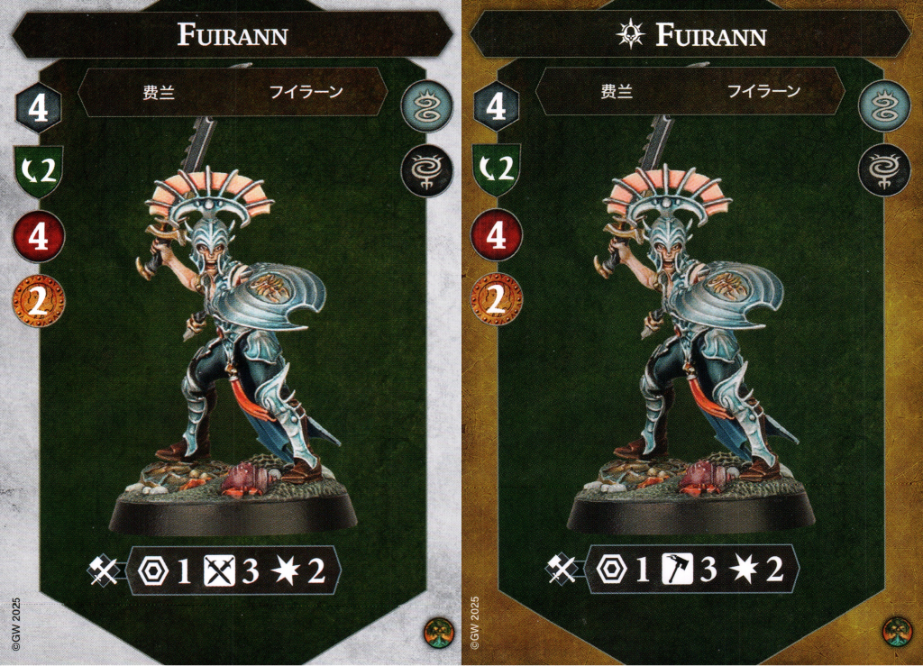 Similar to Elathain, Fuirann is on 4 move and 4 health, but saves on 2 dodge instead of shields. As mentioned in Phantasmal Forms, the durability of this fighter is higher than this appears. Unless Fuirann takes four individual hits for 1 damage or a single 5 damage hit, the damage reduction will add at least a few effective health.