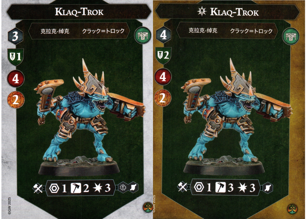 Klaq-Trok is where all of this warband's muscle resides. He's not quite a Kro-Jax from Jaws of Itzl, but he's doing his best impression and all the little skinks think he's just the coolest. Sharing the same 4 health as the leader, Klaq-Trok gets surprisingly tough once inspired and on 2 shields.