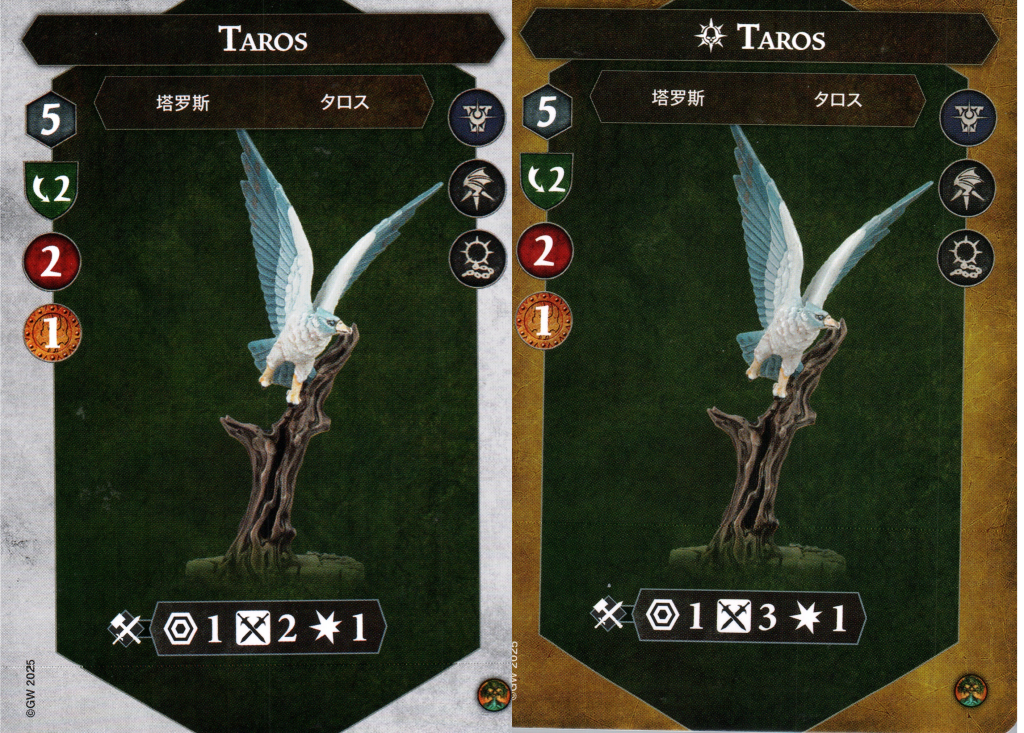 Blake: Taros is the bonus card, and likely the reasoning behind no 2 defense Stormcast. Their card is what you'd expect from a pet style character. Two sword that inspires to 3 sword, one damage attack. Two dodge and 2 health is similar to a goblin profile. I don't expect them to live long, but if they do, they give utility for support/warscroll ability/objective play.