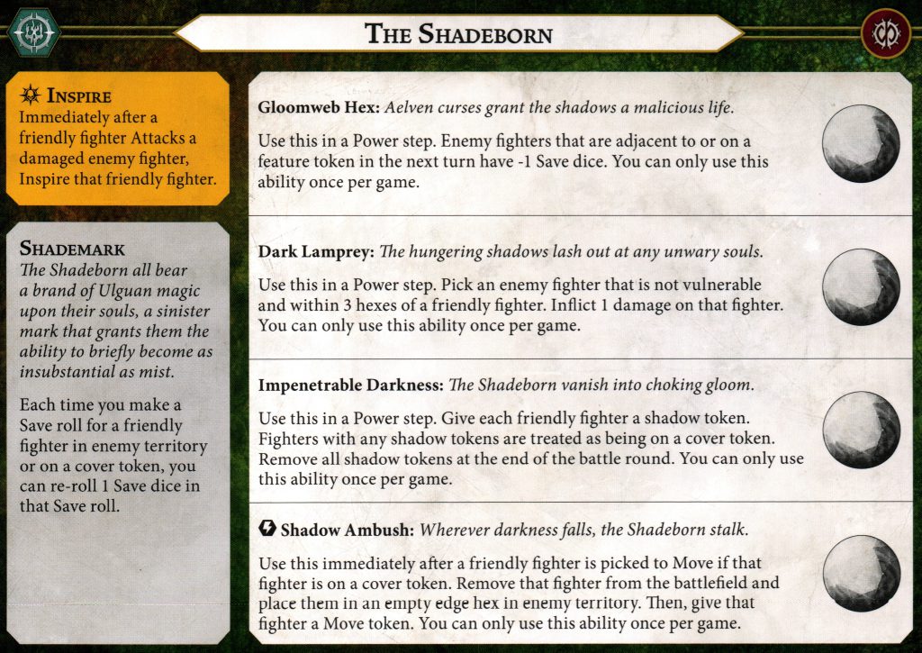 Shadow Ambush. I take it back, this is the coolest effect on the warscroll. Being able to jump from a cover token (even a fake one thanks to Impenetrable Darkness) to any edge hex is some solid maneuverability on a warband that already is faster than average. It also means that until this ability is used, any enemy fighter within one hex of an edge hex is in danger of being charged no matter where they are on the board. The only thing I dislike about Shadow Ambush is how it can only be used once per game. I feel like being once per