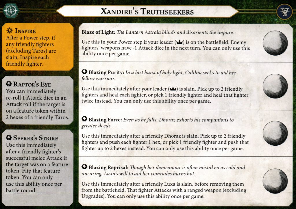 Jake: The inspire condition for the Truthseekers is fully out of your control, but it's not as bad as that sounds. In the vast majority of games, you're going to get attacked and lose a fighter at some point. If you're not, you're probably in a good spot so who cares if you inspire them or not. And while inspiring is obviously nice, your fighters have perfectly serviceable stats uninspired.