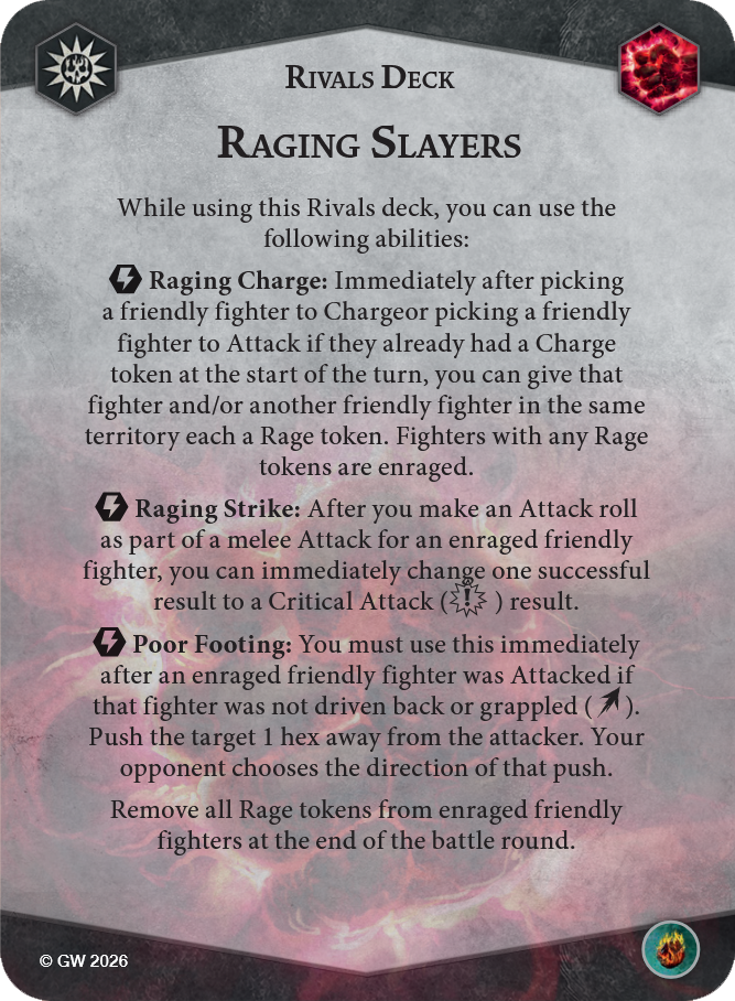 February 2026 rules update: The Raging Slayers plot card has been updated to what's shown above. The changes here were made to