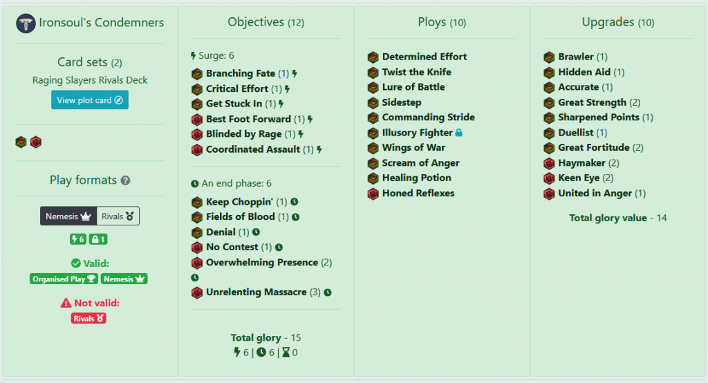 Muras's Raging Slayers and Blazing Assault decklist for Ironsoul's Condemnors. Credit: UnderworldsDB.com