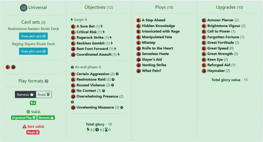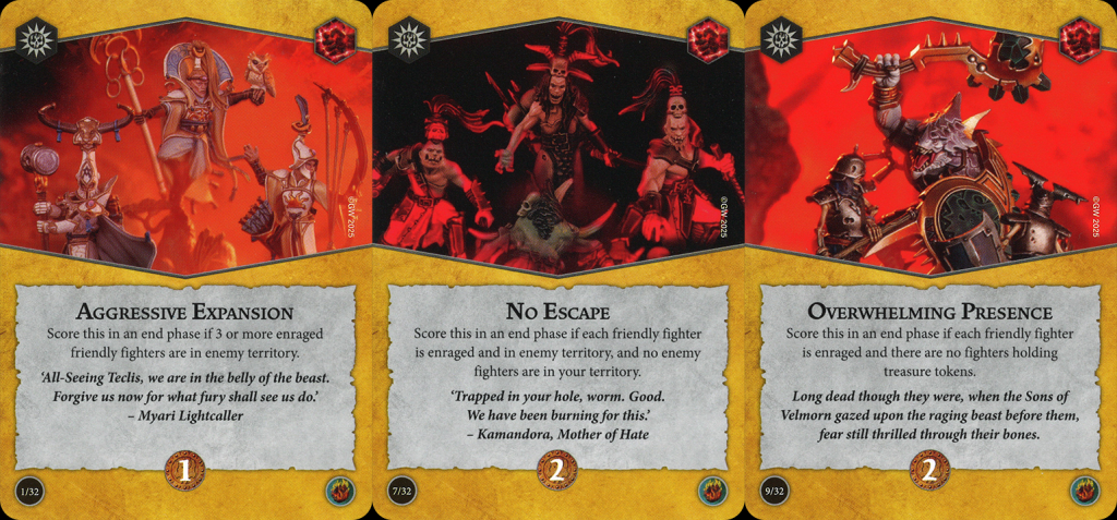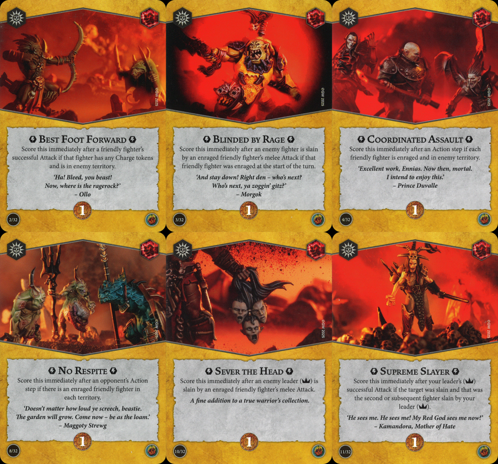No Respite are also both going to be much easier to score when you're able to rain rage tokens down upon your warband. They're still working at odds with each other, which is obnoxious, but you can select the one that's going to be the most reliably scored by your particular warband and include it for a reasonably easy surge if you're planning to do a lot of charging – and that's what this deck is all about, after all.