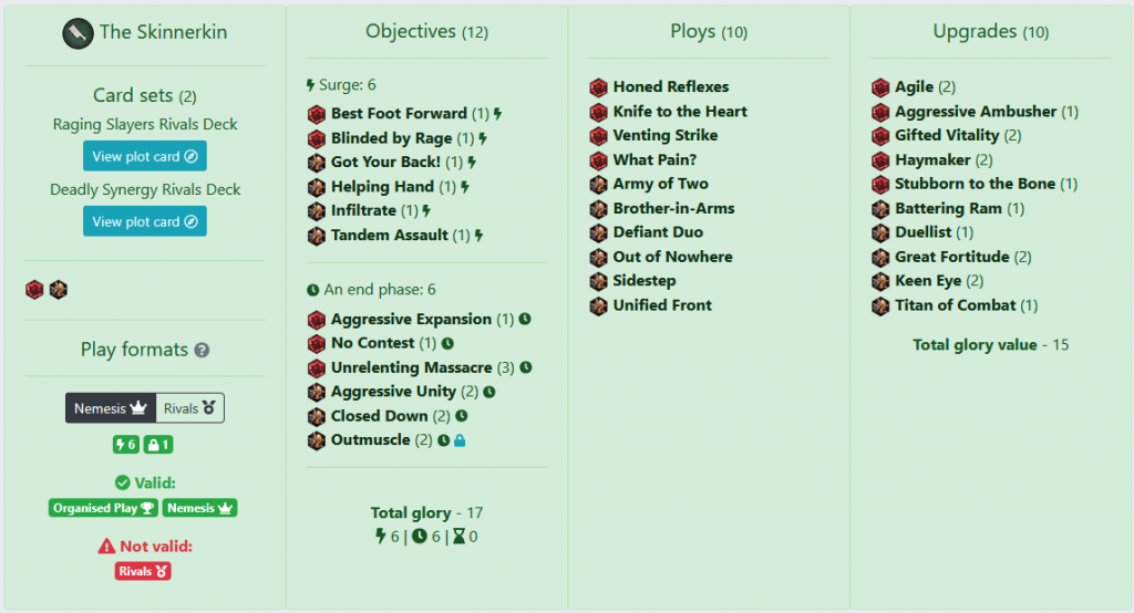 Jesse's Raging Slayers and Deadly Synergy decklist for Skinnerkin. Credit: UnderworldsDB.com