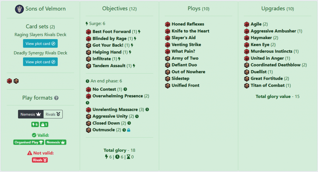 Spinnerite's Raging Slayers and Deadly Synergy decklist for Sons of Velmorn. Credit: UnderworldsDB.com