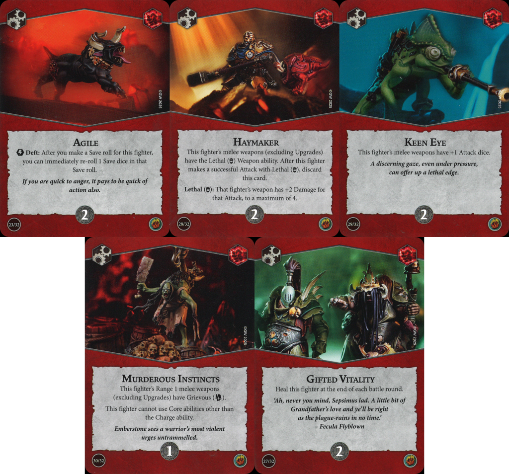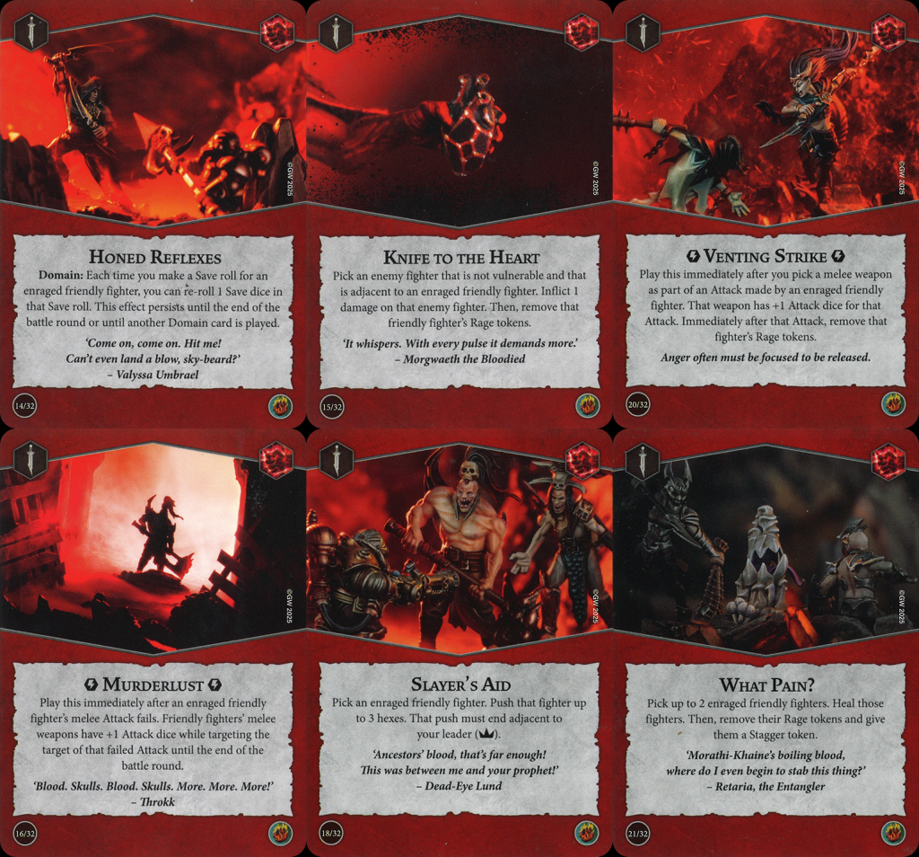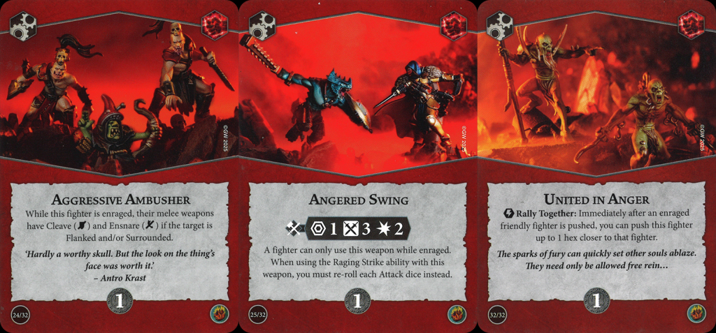 Knife to the Heart likewise was a great card – a guaranteed ping always is – but now the downside of having to remove an rage token is almost non-existent. You can even charge with one fighter, place the rage token on another fighter near an enemy, and then immediately spend that one to fire off a ping. Venting Strike and Murderlust provide an always welcome extra attack dice which is even more useful now that the plot card no longer provides a reroll.