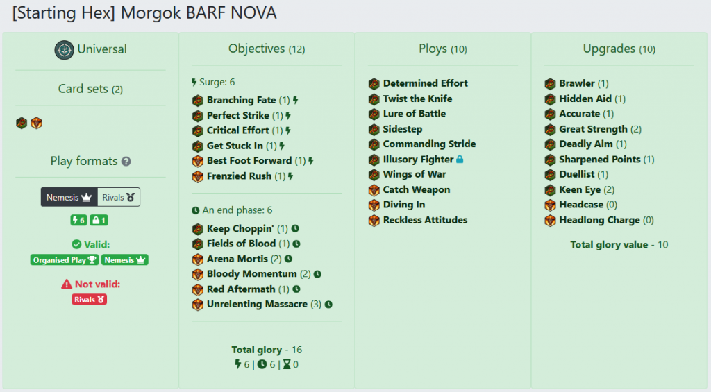 Morgok's Krushas deck that I took to NOVA 2025 as an example for this discussion. This article isn't meant to be a deck breakdown, so I'm not going to go super deep into it, but it just happened to be what I took to my most recent event and also highlights the concept of redundancy in deck building quite nicely. My goal with this deck was to build the most consistent pile of cards that I could while having a game plan that hinged on getting a little lucky with dice on the day of the event. I was hoping that by limiting the randomness to my attack dice (as best I could), I could possibly roll a little hot and rely on that to help balance the scales when playing against better players. You might be able to outplay me, Mark aka Baconborne, but can you outplay my dice when they're rolling crits?