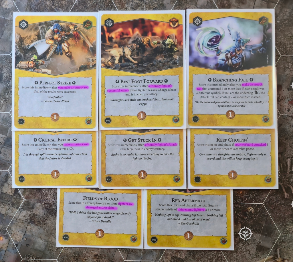 This isn't a convoluted or terribly innovative deck. The Blazing Assault and Reckless Fury pairing has been a staple for aggro warbands since the release of the game at the World Championship of Warhammer last year. The game plan is a very simple and straightforward one in which I want my orcs to run forward and hit the opponent. The card choices I made are to enhance my chances at both running forward and hitting the enemy as much as possible while also having the objectives align with that plan. In a perfect world, every objective would be something like "make an attack" because that's what I want to do in all 12 activations anyway, and all the power cards would just help me in making those attacks.