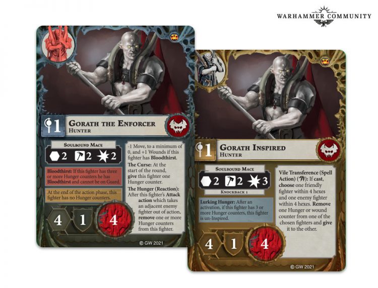 Gorath is the heavy hitter. Range 2, 2 Hammers is always a good starting point, and he gains that all important Damage 3 on inspiration. Alternatively, he can go slower and tankier by giving into Bloodthirst, meaning you can decide to post him up midfield, stack some Hunger tokens, and make him a hard to shift damage dealer. While his Vile Transference spell is potentially quite useful as a healing/utility piece, being a level 1 Wizard makes it unreliable.