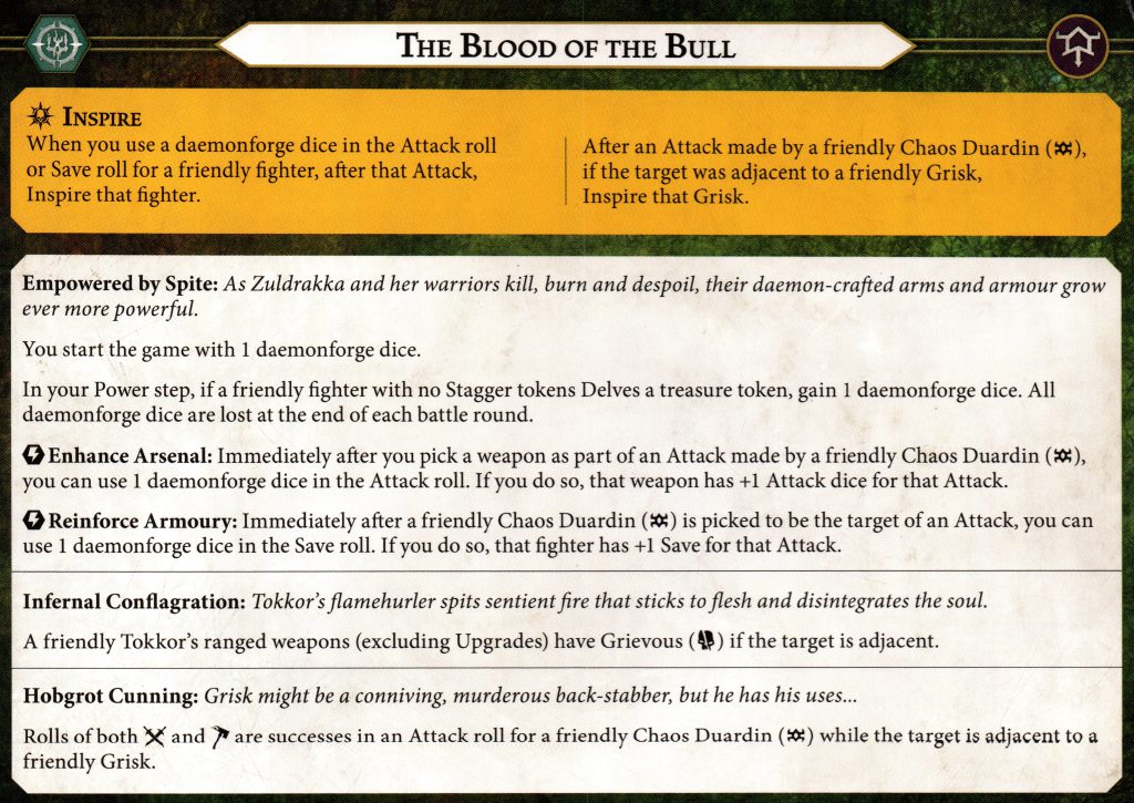 dwarves Duardin and one for special little Grisk. Grisk's is easy; he just needs to stand next to an enemy that one of your other fighters attacks. It doesn't even have to be successful. The rest of your fighters all require you to spend the special resource that this warband generates on an attack or save in order to inspire. Note the timing is that they inspire