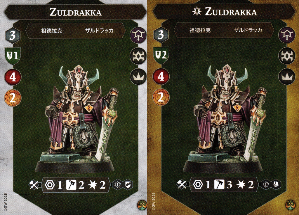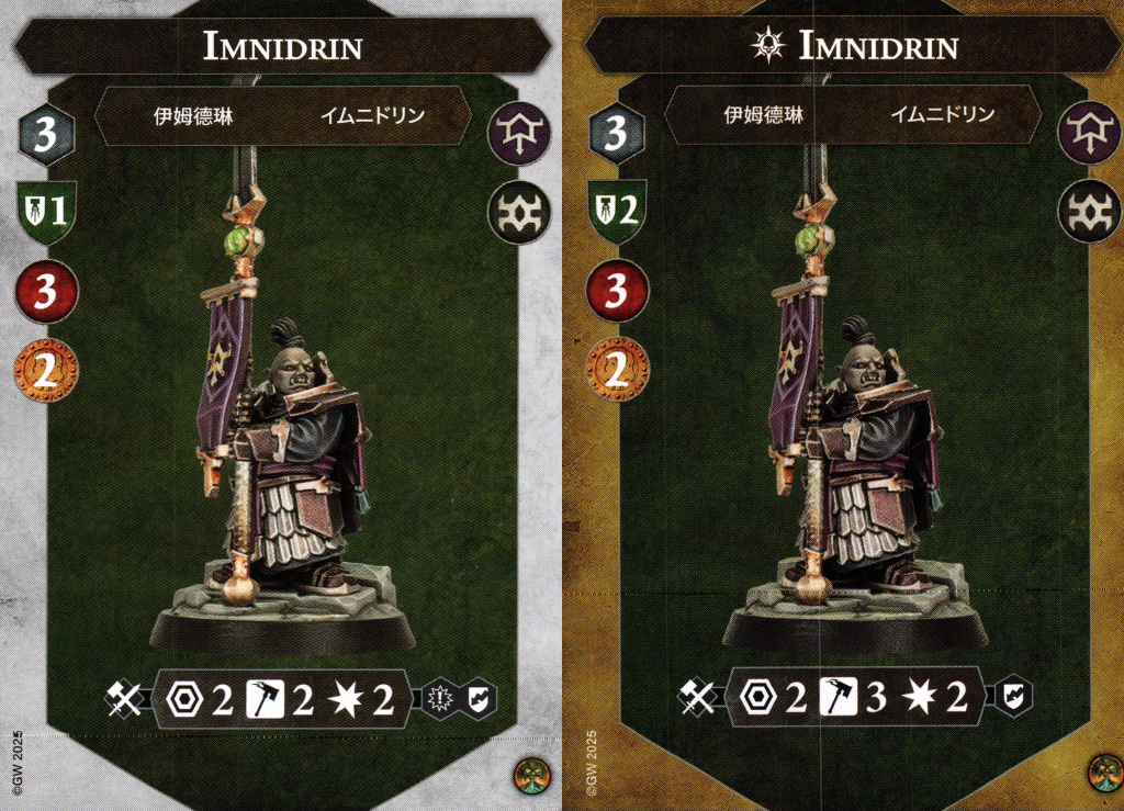 Imindrin is clearly the second in command here. Not necessarily because of her bounty value also being 2, but because she has a big ol' daemon battery powered banner that doubles as a spear. She has the same defensive profile as Zuldrakka aside from being one less health, including jumping up to 2 shields on the inspired side.