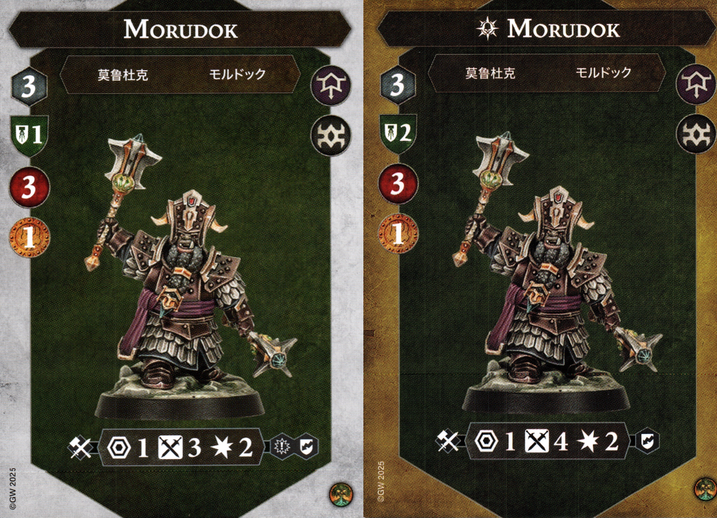 The first bearded fighter of this warband shows up! Morudok continues the trend of being 3 move, 3 health, and 1 shield but is also the first single bounty fighter. Once inspired, he follows the ladies' lead by jumping up to 2 shields for his save despite clearly walking around with two hammers. Maybe he's blocking with his beard. This low bounty and high durability makes him a pretty decent dangle fighter to put on the front line if you want to protect some of your more valuable fighters early in the game.