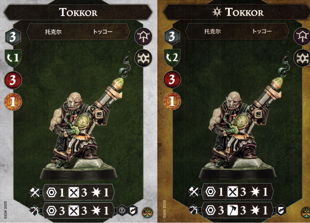 Tokkor technically has a melee weapon, but it will be a rare circumstance indeed for you to ever choose it over his flamechurler (what a silly name). With the ranged weapon serving double duty as a range 3 attack and also a range 1 grievous attack, it outshines the melee profile even when uninspired. Once he inspires, the swords accuracy upgrades to hammers while the melee profile stays the same. This means that Tokkor is a fourth fighter in this warband who starts on 2 damage. Surely the trend can't continue?