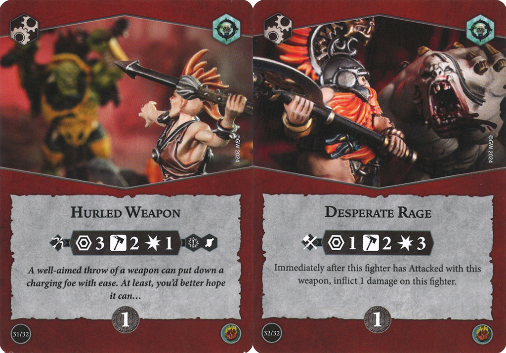 Another pair of weapons from the original release, Hurled Weapon and Desperate Rage also show up a fair bit in Nemesis decks. Hurled Weapon is a valuable ranged 3 attack that's occasionally more accurate than its 2 hammers would imply (which is already a baseline of "not too bad") and Desperate Rage uniquely is the only weapon so far that has a natural 3 damage – that's a substantial hit and it does come with a downside of hurting your own fighter, but for 1 glory it's still one heck of a bargain.