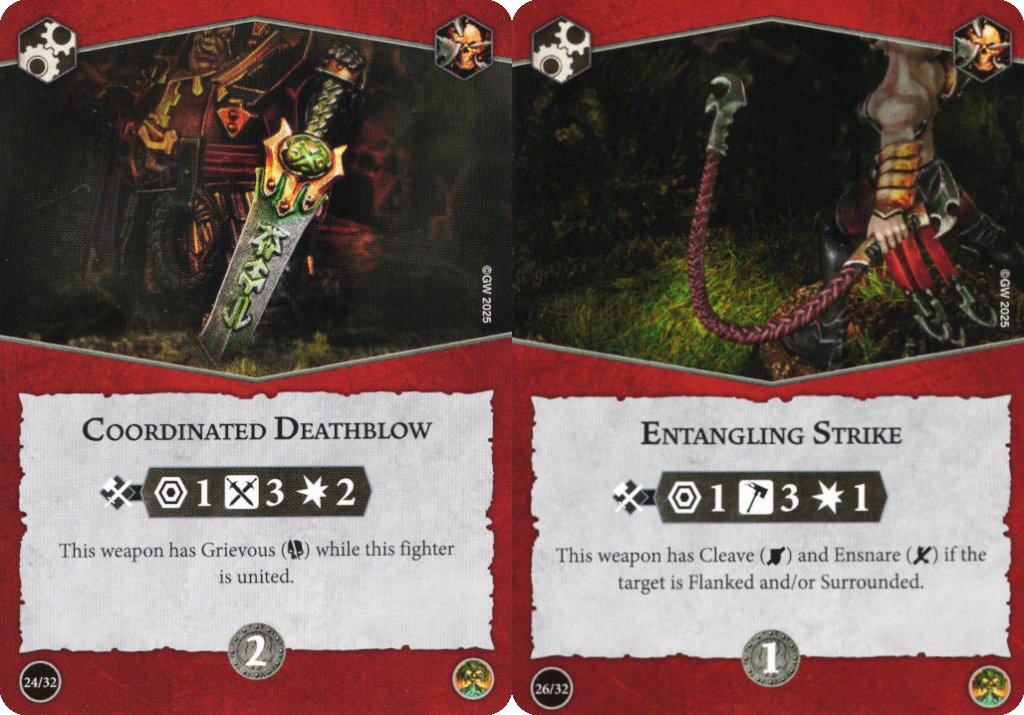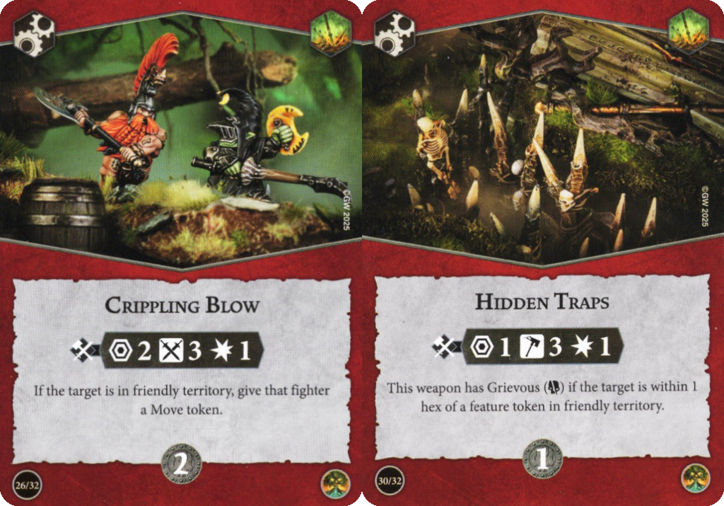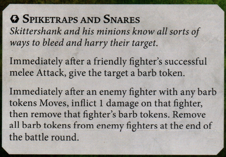 Leverage warscroll abilities: Many warscrolls offer unique benefits for their fighters making attacks, but some of them are also transferable to attacks made with weapon upgrades. The new Skittershank's Clawpack for instance allows all friendly fighters' melee attacks to apply barb tokens that damage the enemy if they move. This isn't limited to their fighter card attacks, so you can take one of the two ranged-only fighters in this warband and equip them with an Entangling Strike or Hidden Traps to give them some highly accurate melee attacks to hand out barb tokens. Likewise, all the ways the Skinnerkin can spend haunch tokens to enhance their melee attacks can also work with weapon upgrades – add a re-roll to Coordinated Deathblow or Desperate Rage to get some reliable damage 3 attacks or tack grievous onto Angered Swing for a different route to the same reliable 3 damage. Carefully read your warband's warscroll abilities to see if you can leverage weapons to help them out.