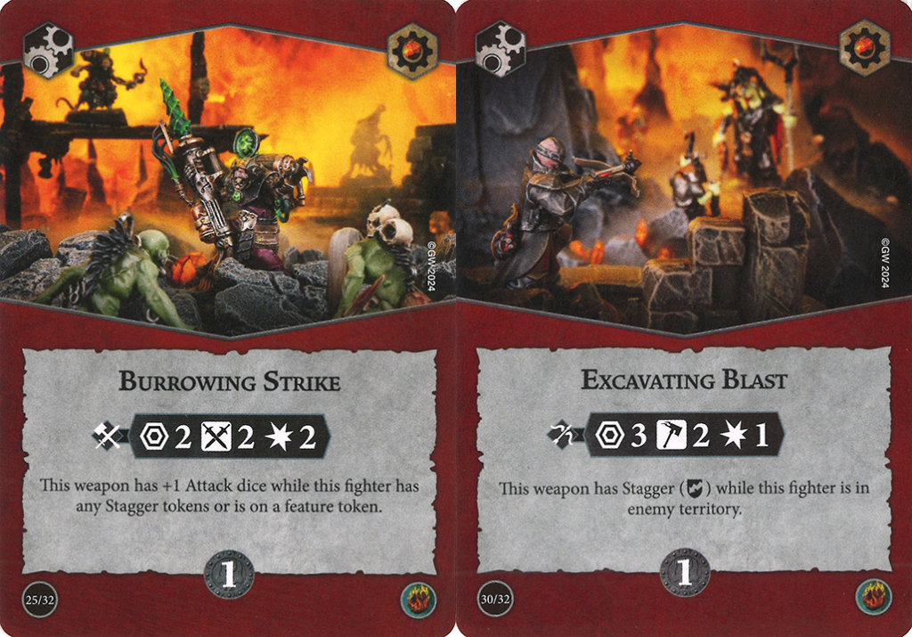 These two weapons have the benefit of both having some extra range on them as well as the potential of both being fairly accurate. They both have a fair bit of utility from that and Burrowing Strike even deals 2 damage which is a nice upgrade for many fighters who only have 1 damage attacks. Due to the gameplan of Pillage & Plunder, Burrowing Strike is often able to pick up that extra attack dice while Excavating Blast's conditional stagger has rarely come up for me. I'll be honest, I think I've simply forgotten about it in many games.