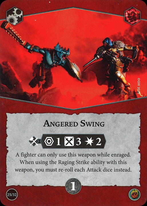 Angered Swing is another weapon that interacts in a special way with its deck's plot card. By itself, it's not too bad in terms of damage or accuracy but once you unlock the full attack dice re-roll through the Raging Slayer's plot card ability, you can do some fun stuff with it.