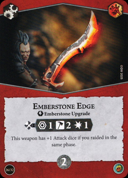 Emberstone Edge is a fairly niche weapon. One of the main things that makes it unique is that it's an Emberstone Upgrade and thus interacts in a special manner with its deck's plot card. I believe the design is intended so that you have access to a reliably accurate melee attack once you pick up the bonus attack dice which will enable future raid triggers. If you're taking a warband with a few low accuracy fighters in the Realmstone Raiders deck, this could come in handy presuming you want to use it to score – damage wise, it's nothing impressive and it's also tied for the most expensive weapon upgrade at 2 glory.