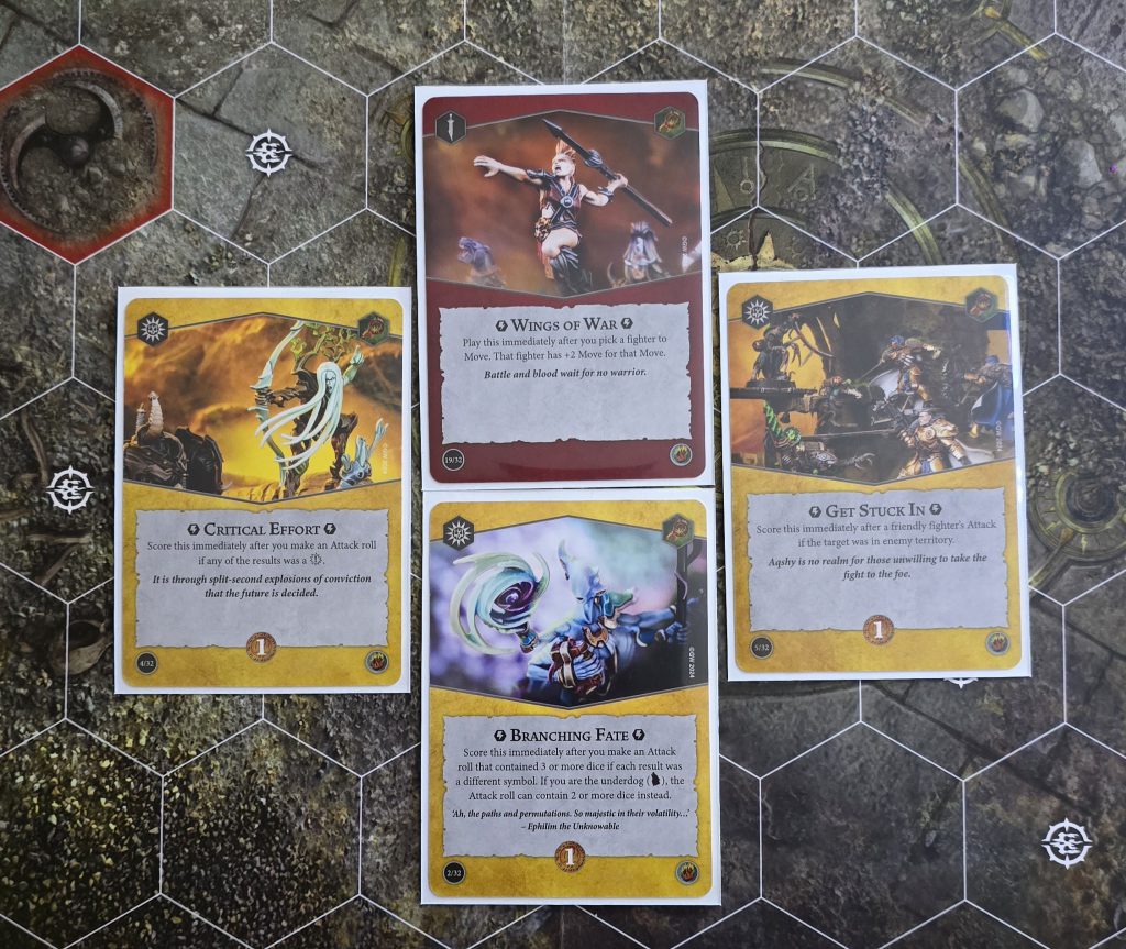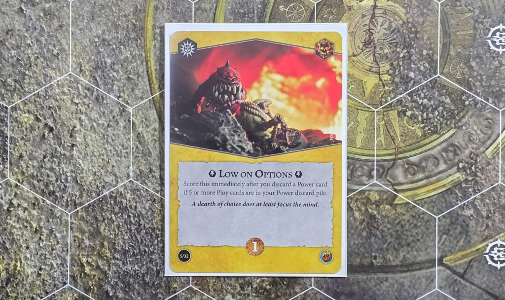 Low on Options can be scored if the discarded power card that triggers the surge window happens to be an upgrade from a fighter that is slain provided you already have 5 or more ploys in your discard pile. This ruling paves the way for any other discarded power cards to also trigger the surge objective. Think of things like Canny Sapper and Impossibly Quick from the Pillage and Plunder deck or if an opposing Thricefold Discord uses their Vile Temptations on one of your fighters.