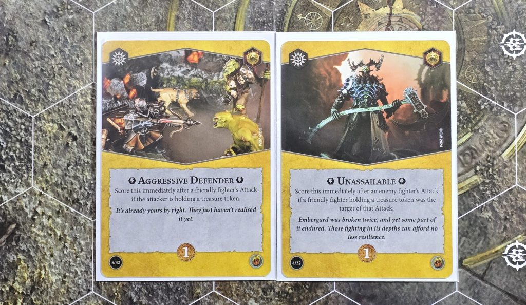 Unassailable is the one that seems to have multiple interpretations out there. Does it count if your fighter was attacked and driven off an objective? Does it only count if your fighter is attacked and remains on the objective? Does it matter if your fighter dies in the attack? The answers for those questions are no, yes, and no, respectively. Your fighter has to be holding a treasure token when targeted with the attack and must be holding a treasure token after the attack is resolved. There’s not currently a way to do this, but I guess it would still be able to be scored if you are on a treasure token and then driven back