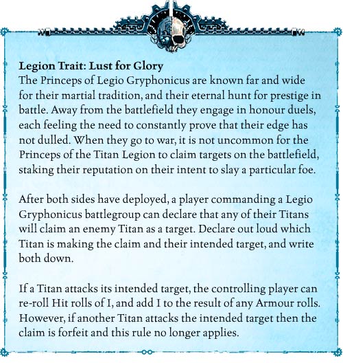 Unlike many of the other Titan Legions, all three of the War Griffons' personal traits are useful. The most obviously powerful of these is