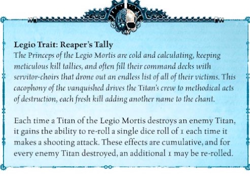 Condit: We've said it before, and I'll say it again here: there aren't a lot of reliable sources of re-rolls in Titanicus, so every one you can get counts. A Warlord with 2 or more stacks of Reaper's Tally can be a terrifying late-game threat.