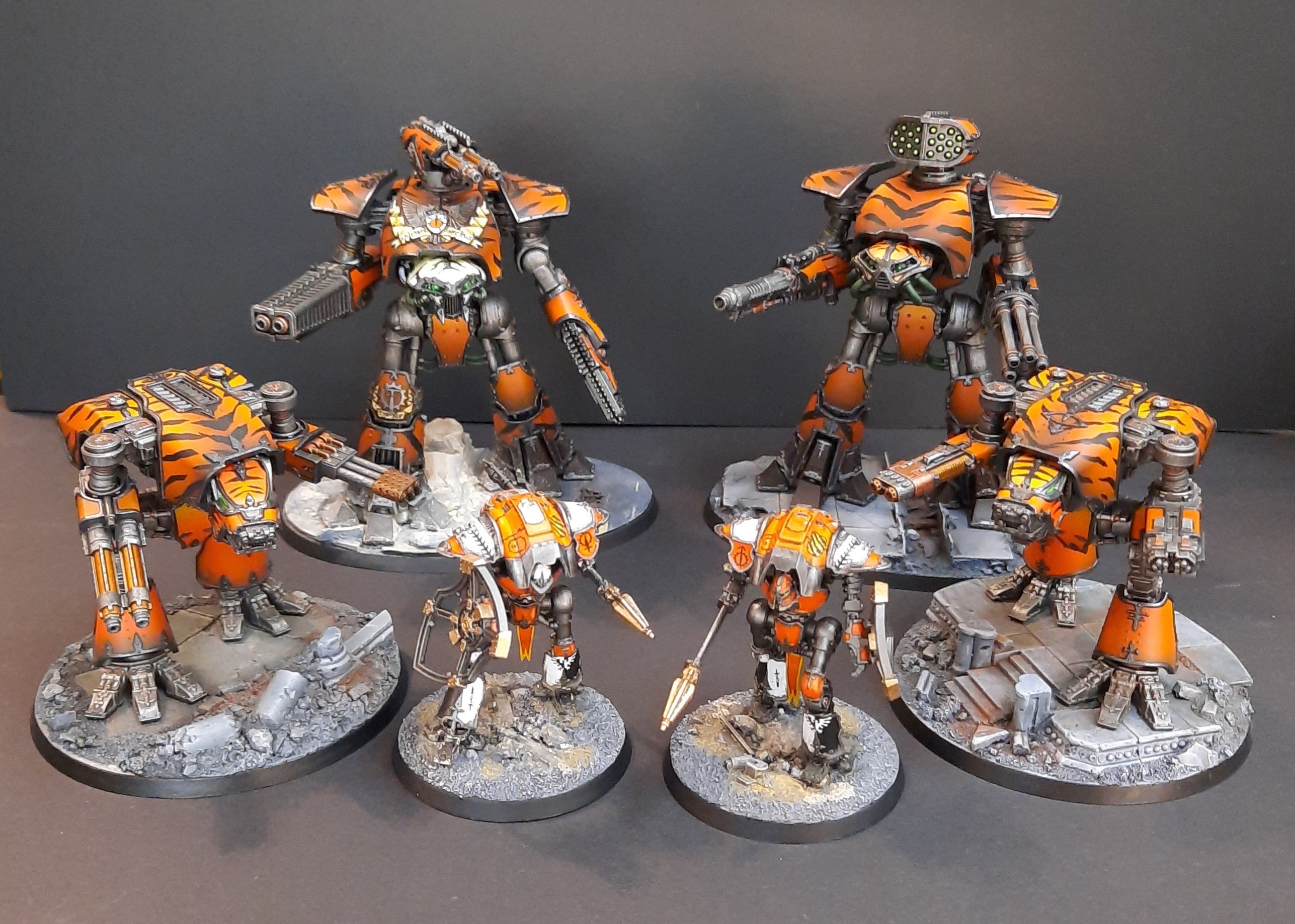 Legio Magna Titans were the first to open fire in what would ultimately result in the Schism of Mars. Later during the Heresy, after the Titandeath of Beta-Garmon Loyalist survivors fled to Ryza to rally. Estaban’s Fabricator-Locum was responsible for the capture of the world and fielded the Legion alongside Legio Mortis and Vulturum, ultimately laying waste to the jewel of the ‘Furnace of the Shackled Stars’.