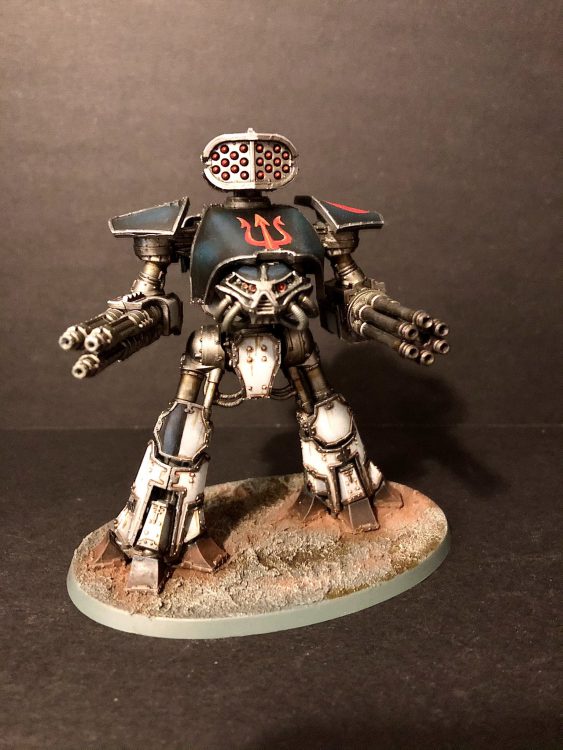 Rust : Varnish your plates with whatever you choose (I would probably do satin but I think I did Matte) and then bust out your favorite enamels / oils from whatever brand it is you choose. I initially did an all over pass with a “rust streaks'' product that produces a bit of a darker orangish rust, not quite going to the ancient red rust. After that dries for about an hour or so, use a lighter rust color to do some actual streaking / pooling in the deep parts of plates. The warlord was a labor of love and I think the rust came out wonderfully in it. If you’re going to use a model for inspiration to do Tritonis, use that one.