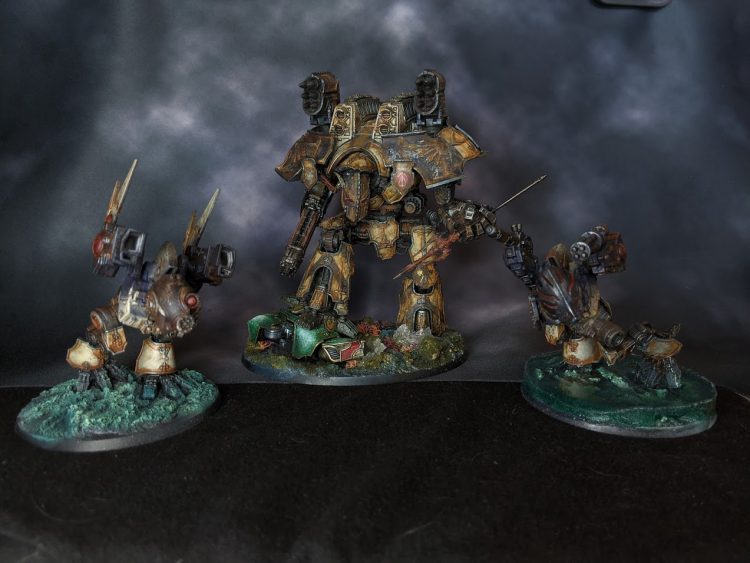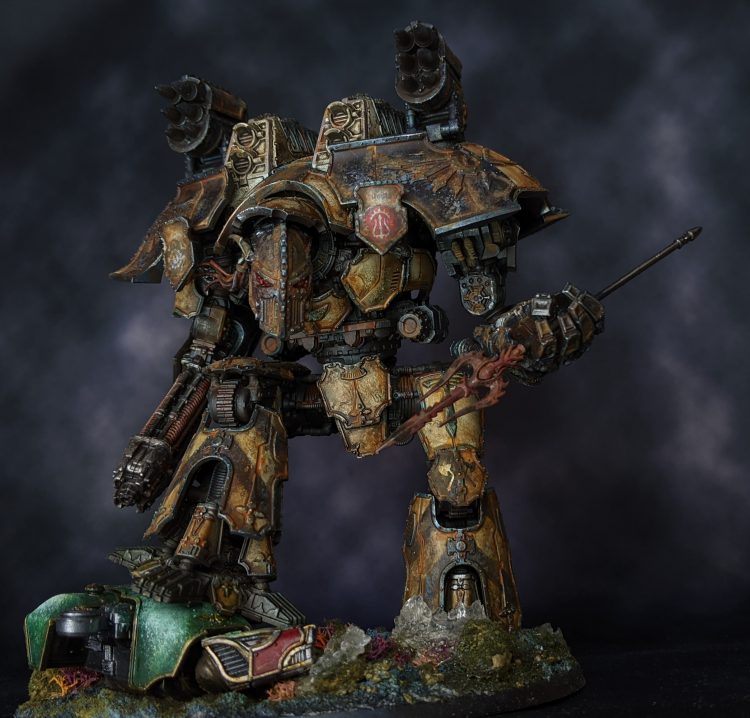Basing : basing was a lot of various enamel effects and pigments and water effects and loyalist titans and lichen as corals. Basing is hard and we were trying out a bunch of things at the time and that’s why the warhounds' bases aren't done / one is ugly.
