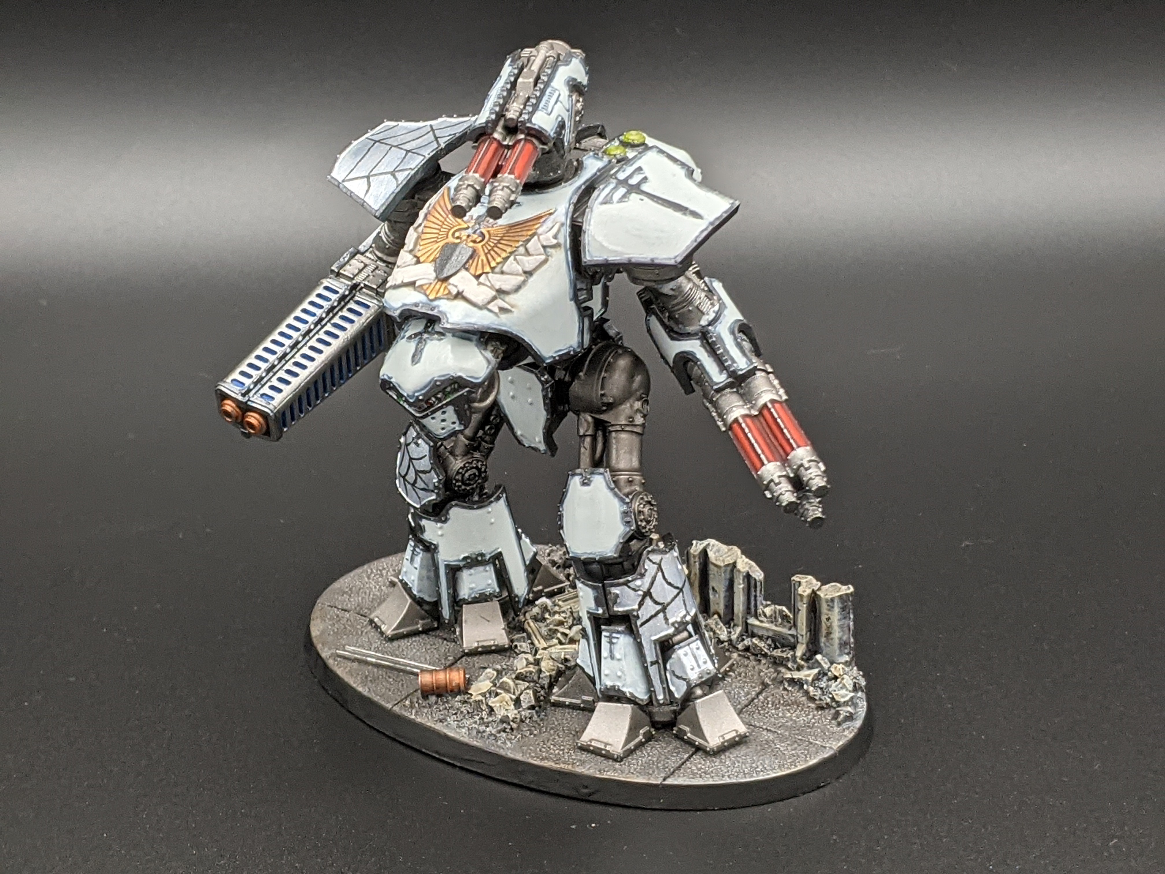 The “skeleton” of the Titan is pretty standard: I start by priming black, then do a sort of faux-zenithal with rattle-can Leadbelcher over top to create some depth. A quick wash of thinned Nuln Oil and some minor drybrush highlights brings you to something workable.