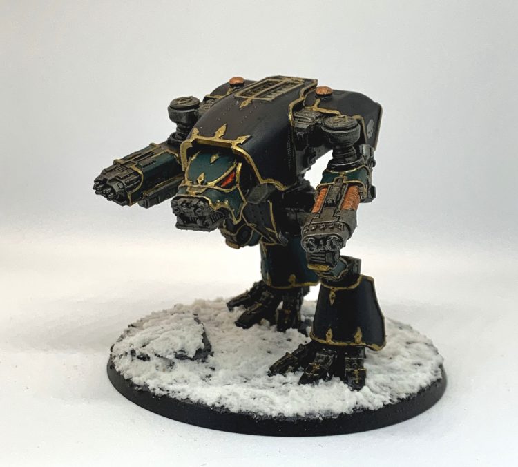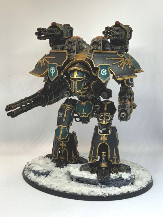 Legio Vulcanum have two slightly different colour schemes, both are primarily black with a gold trim, but one of the Legios is more a teal secondary colour whereas the other is more green. I’ve chosen to paint all of my engines so far in the teal scheme. I also build the entire model before applying any paint, but weapons are magnetised for ease of choice between games.