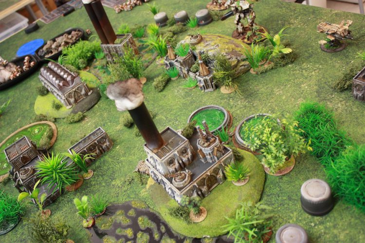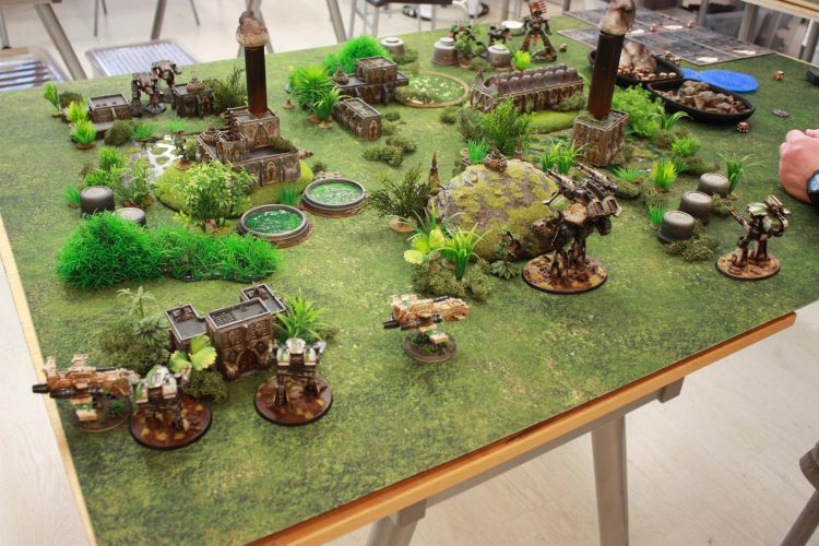 Aside from what you put on the battlefield, there is what you actually put it on. There are a number of vendors out there, such as TableWar or DeepCut Studio, who make mats in the right scale which will bring everything together. If you’ve got a 6’x4’ mat, you can also use that, but will probably want to mark off a 4’x4’ playing area unless you’re playing a truly massive game. That’s fine, though, as the extra space will give plenty of room for you and your opponent to set up your terminals.