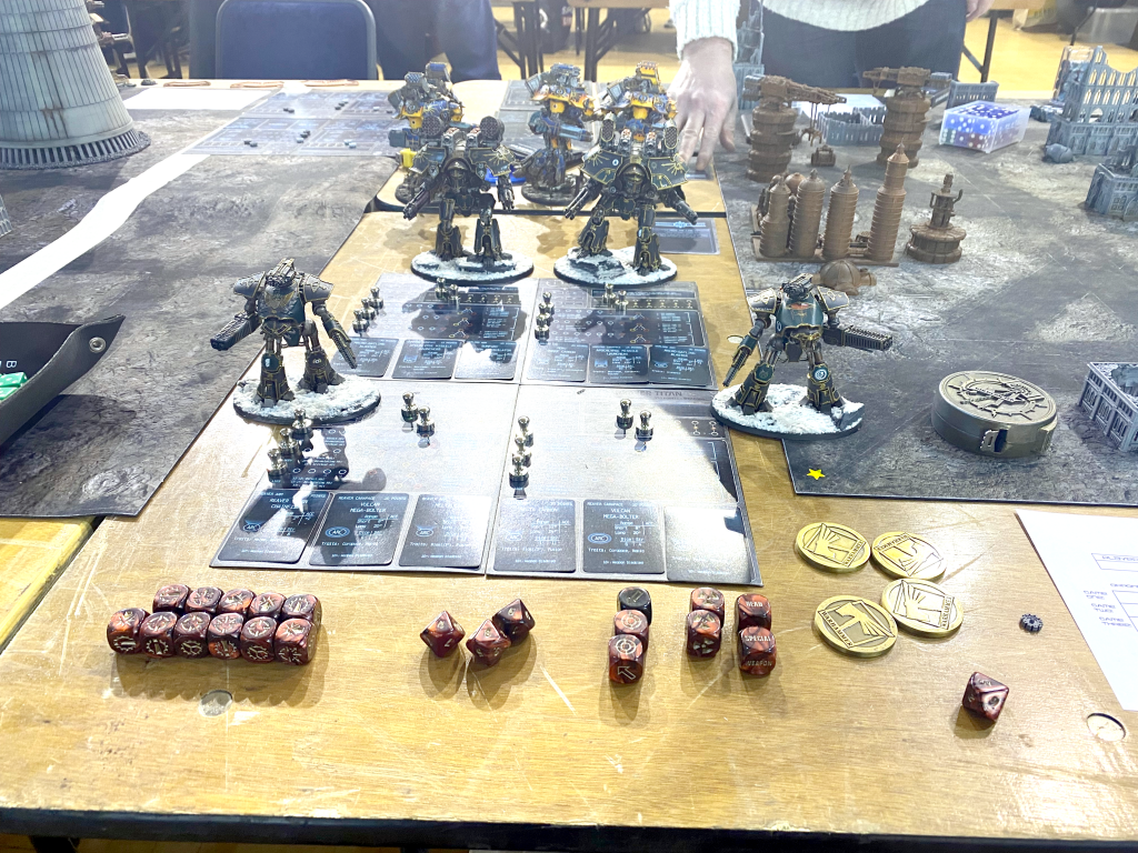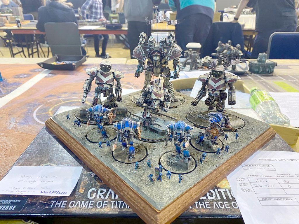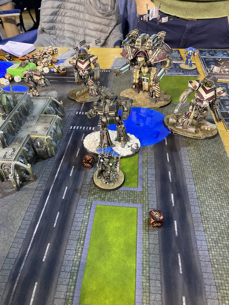 The last game of the first day was against the first person I played in my first Titanicus event at the 2020 Warhammer World narrative event , Dan, and it was great to get the chance to again. He brought a Psi Titan with a Ferrox Maniple of titans not belonging to any legio and this really threw me too since it meant I only had 3 stratagem points to play with instead of the “normal” 5 that you expect at 1750 points. That Psi Titan is no joke too; I hadn’t had the chance to play against it before, and only piloted one a handful of times, but I knew it was deadly. My first mistake was not taking Concealment Barrage; instead I took War Lust for speed and Last Ditch Effort which in retrospect was real dumb. My second mistake was deploying “normally” with my Reavers in base contact, just waiting to be hit by the psychic quake power turn one, absolutely neutering their movement for the first 2 turns of the game. I pushed up as best I could with Full Stride orders but couldn’t dodge the shots coming from the Psi-Titan and took a loss.
