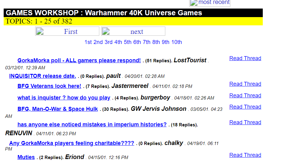 Some of the last Gorkamorka posts. Capture from GW "Warhammer 40,000 Worlds" subforum, December 2001. Via Waybackmachine