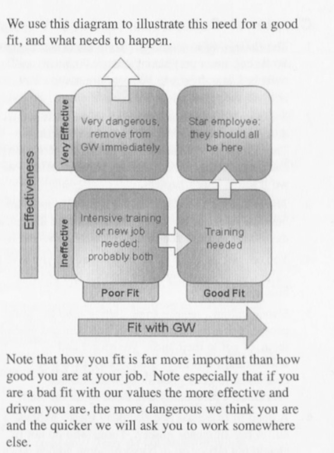 far more important [emphasis ours] than how good you are at your job. Note especially that if you are a bad fit with our values the more effective and driven you are, the more dangerous we think you are and the quicker we will ask you to work somewhere else."