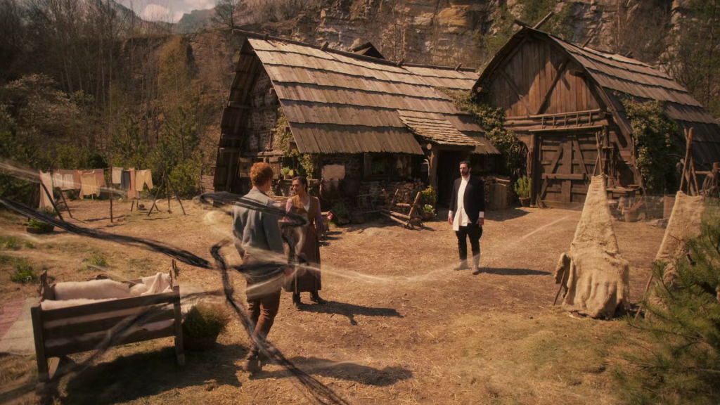 A way the show is not in conversation with Jackson’s Lord of the Rings and hews much closer to The Witcher is, of course, budget and scope. I am far more inclined to be forgiving here than some might, mainly because when I like something I care less about how good the CGI tricks are to keep me invested, and I’m pretty sure that’s a normal response. At the very least they lean into practical effects where they can; GQ ran a piece on this subject a few months ago detailing the prosthetics they used for the trolloc costumes and that yes, they really did build an entire Two Rivers just to burn it down in the first episode. One thing not directly touched on in the piece is the way that, say, the offensive spellcasting used in episode four’s fight with the army of the false Dragon Logain Ablar, is modelled to resemble real-world artillery fire into enemy ranks rather than conjured fireballs or ice blasts. Not only does it look better for cheaper, but it’s far more visceral, and all you really have to do is safely huck a few guys in the air and do some compositing in post, both things with long, proud lineages in the Western film tradition.