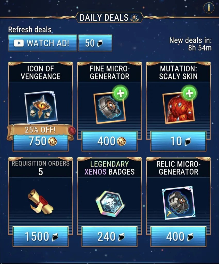 I’m going to list each currency in Tacticus, where you get it, what it’s used for, and when it bottlenecks you. That last one deserves some explanation – at different stages of the game, you’ll find yourself specifically needing one currency or another, and as you pupate from a wriggling Tactigrub to a beautiful Tactifly, which currency you have the most need for will switch.