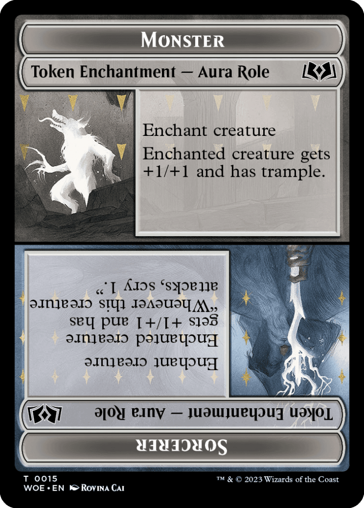 Up till now enchantment tokens have been fairly rare, either coming from the ability to copy any permanent or copy a spell thus creating a token permanent, or a few creatures that created creature enchantment tokens, or a couple of planeswalkers. What's even more rare about these tokens is they are specifically auras. Most of these are being created by creature ETBs, and the limit of only having 1 role controlled by a player creatures a hard limit on this getting out of control. This means putting a cursed role onto an opponents creature will generate an artifact ETB. It also means in theory a creature could have as many as 4 roles, though as only one of the roles is really a debuff.