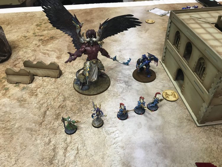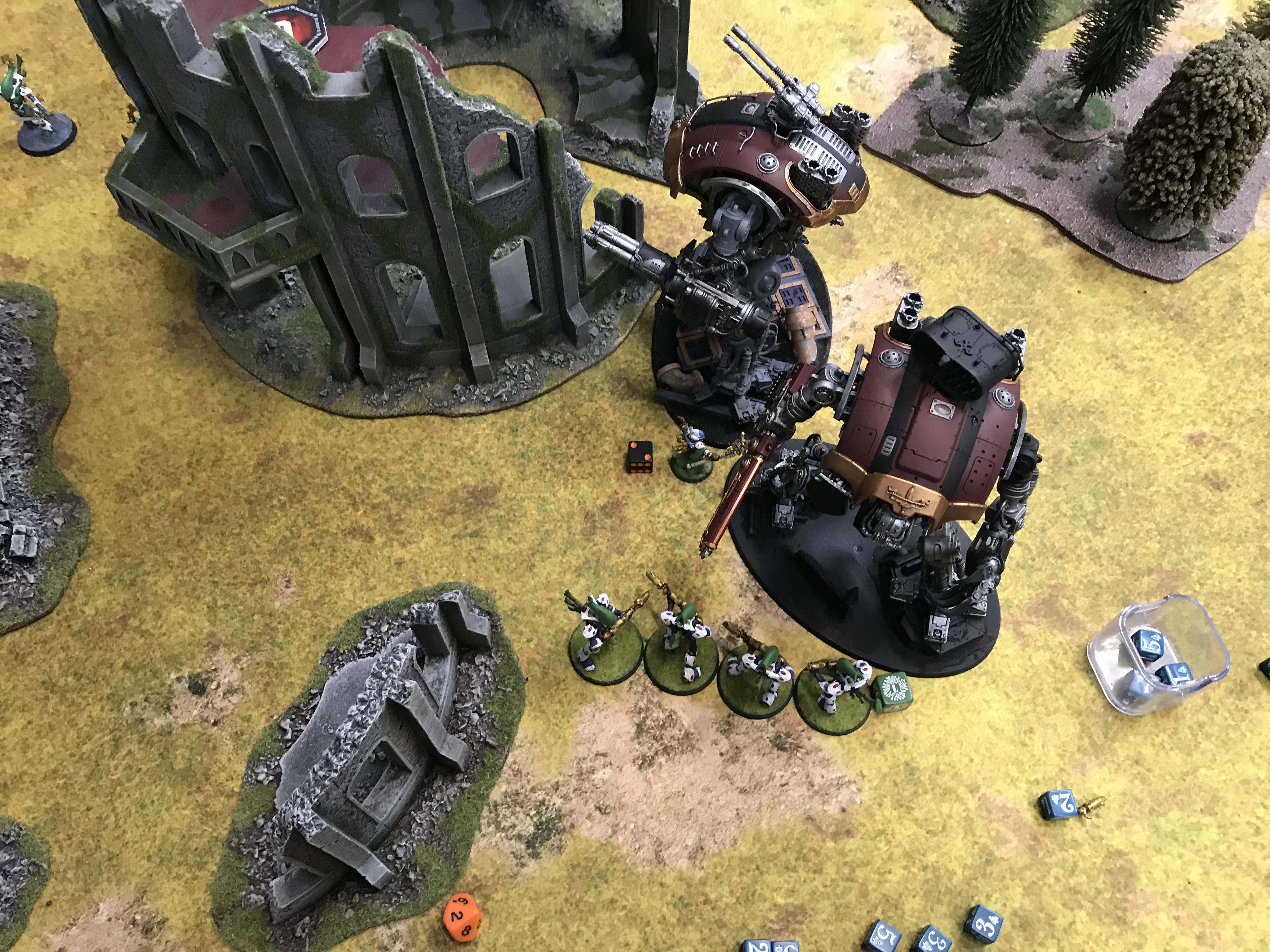 not over on the spot by overperforming massively on turn 2, taking out Magnus and a Knight to put me firmly back in the game. We were playing a game with progressive scoring, and I focused on maximising my points from that, forcing his remaining two Knights to stomp around the board prising my stuff out from ruins and using all the now-departed flyer move blocking tricks to lock them in place.