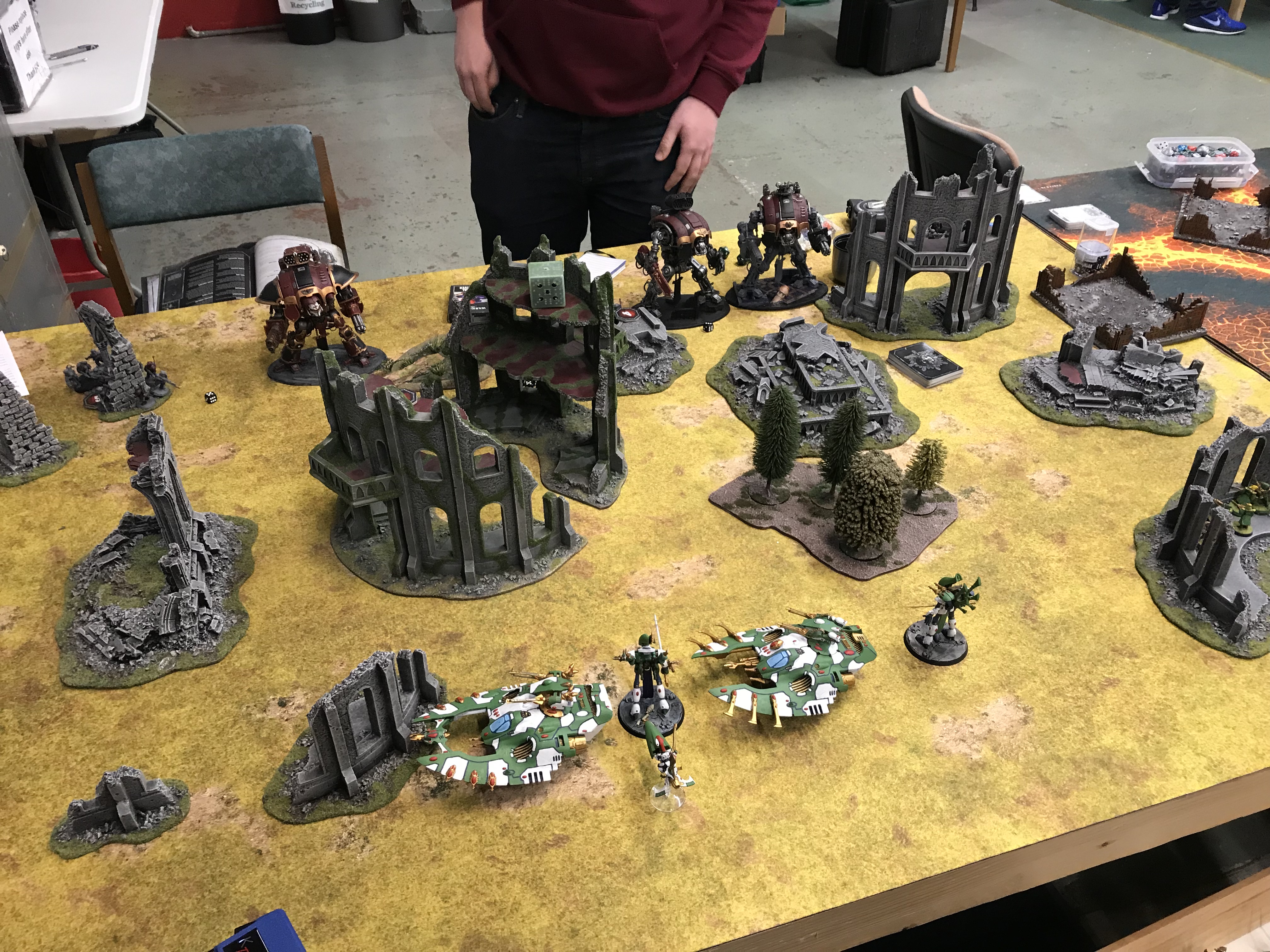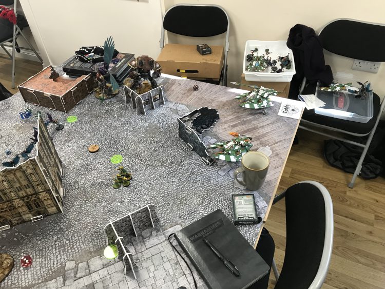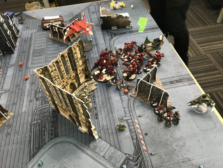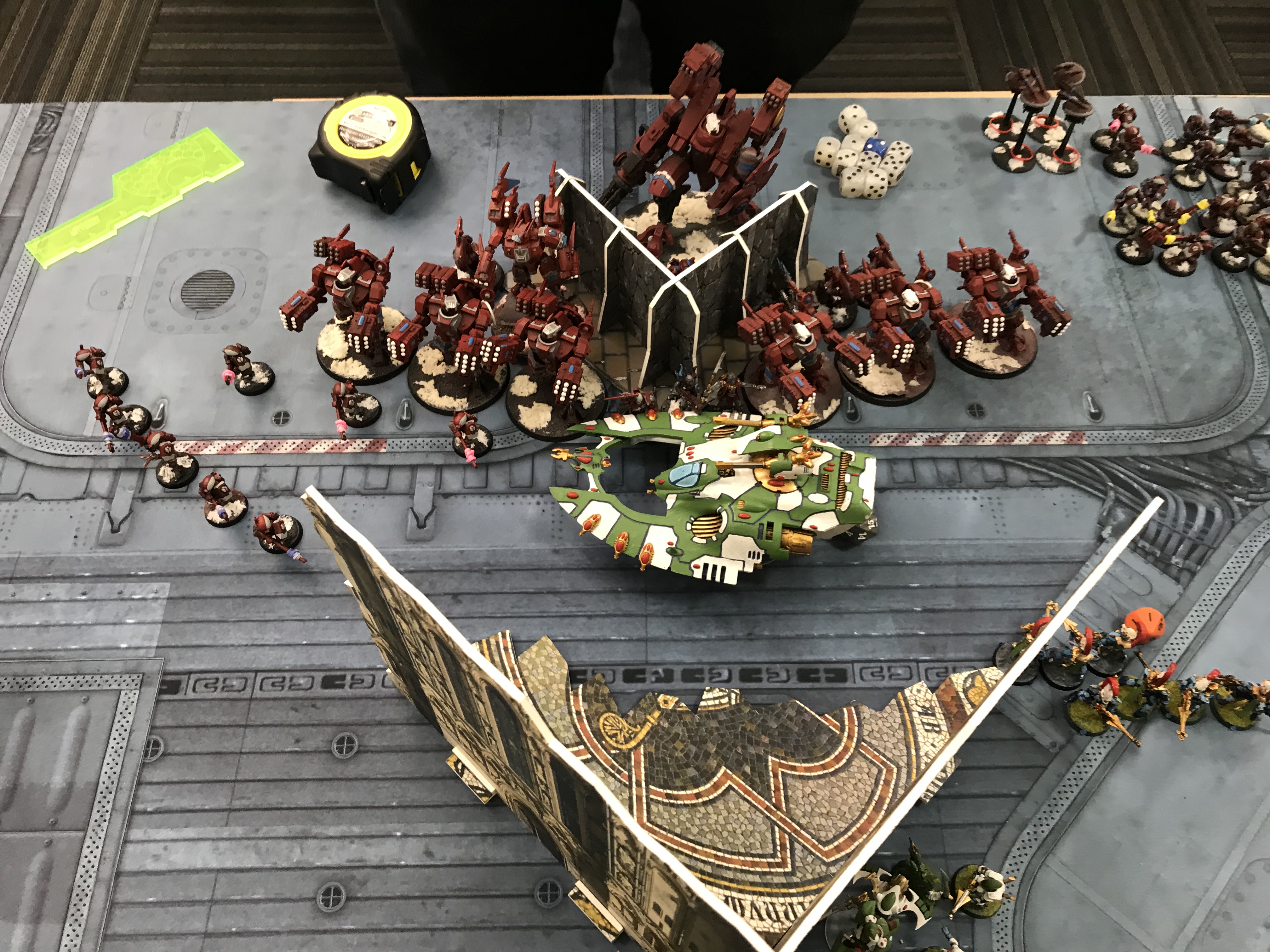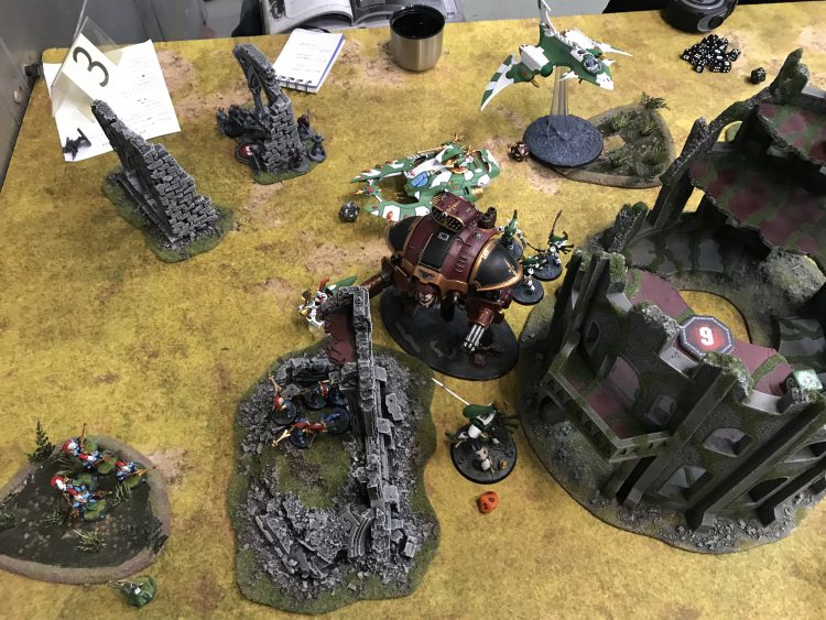 I had a refined version of my mechanised Eldar/Drukhari lists, featuring two (here largely useless) squads of Scourges as a nod to the number of Knights in the metagame, while Kyle had a Shadowsun castle Tau list featuring two big units of Broadsides and a lot of drones. Could I smash the castle open?