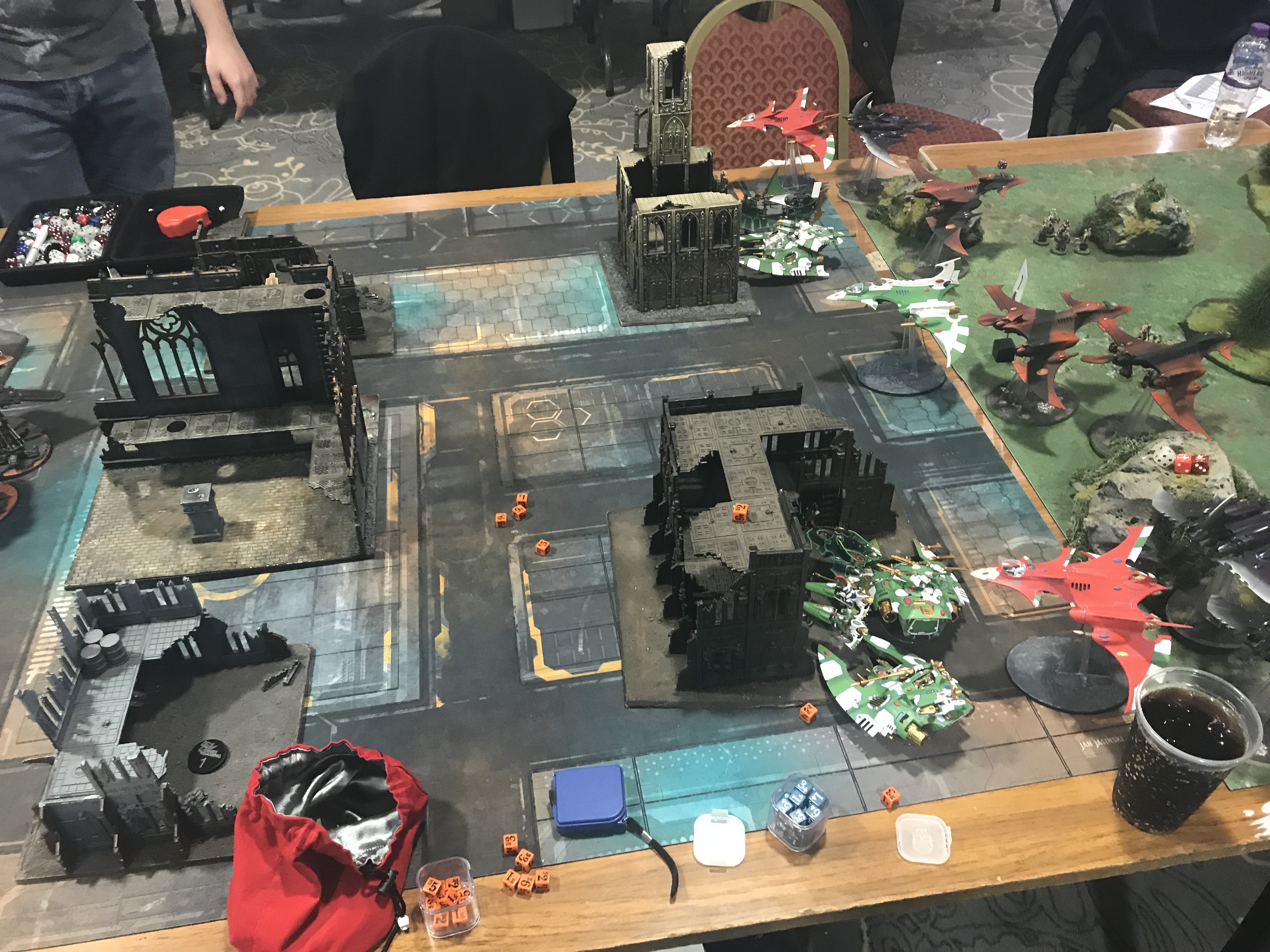They did, though, and combined with some very lucky saves on my Hemlock, which was having one of those games where it just wouldn't die, things suddenly flipped around to going my way - I managed to finish off the Knights, and while I had an incredibly light board left (something like a Farseer, Spiritseer, two Wraithblades and a Hemlock) he had basically nothing left that could threaten them - the Wraithblades were lurking in a middle ruin and thus essentially indestructible to lasguns and Guard fists, and on my final turn I was able to fly my Hemlock into his deployment zone and pick off a unit to put me just ahead, including Linebreaker.