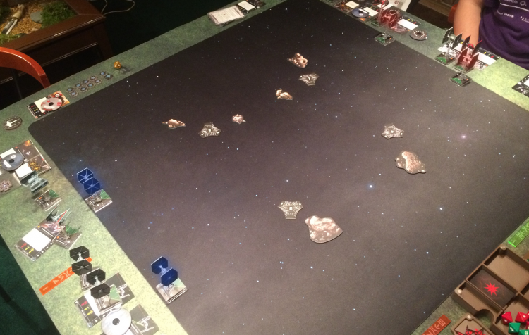 - Shots Fired: Games one and two seemed to indicate that the HotAC AI was better at maneuvering than the Solo AI, and this game three confirmed it. The Solo AI only got 11 shots off the entire game, while the HotAC AI more than tripled that score with 36 shots. This has nothing to do with one AI being "first player," since we alternated each turn, and pretty solidly confirms that the HotAC AI is better at both homing in on a target and, possibly, using reposition actions to dodge arcs.